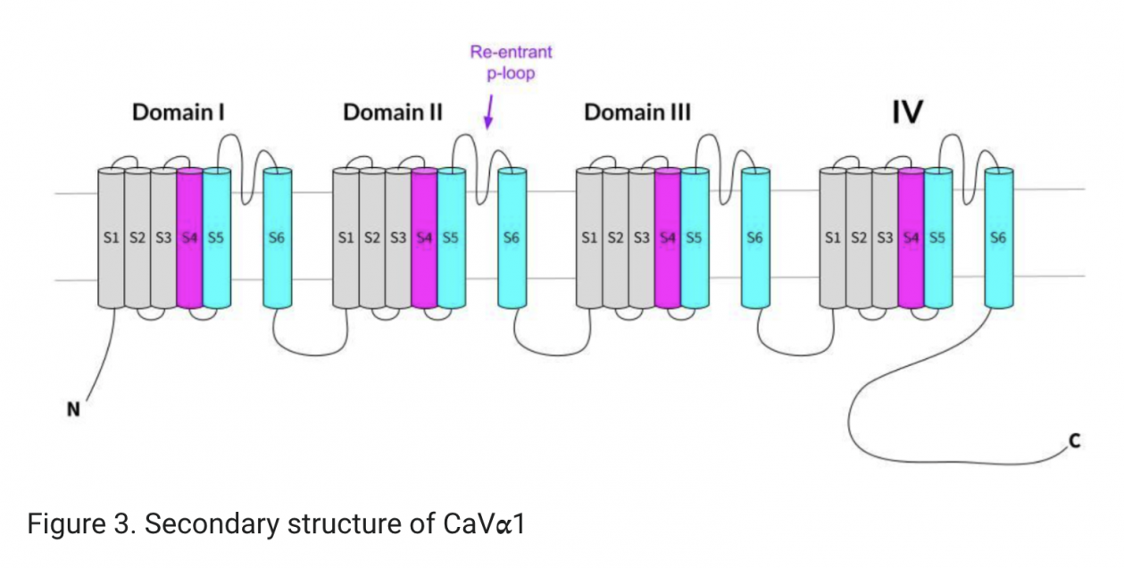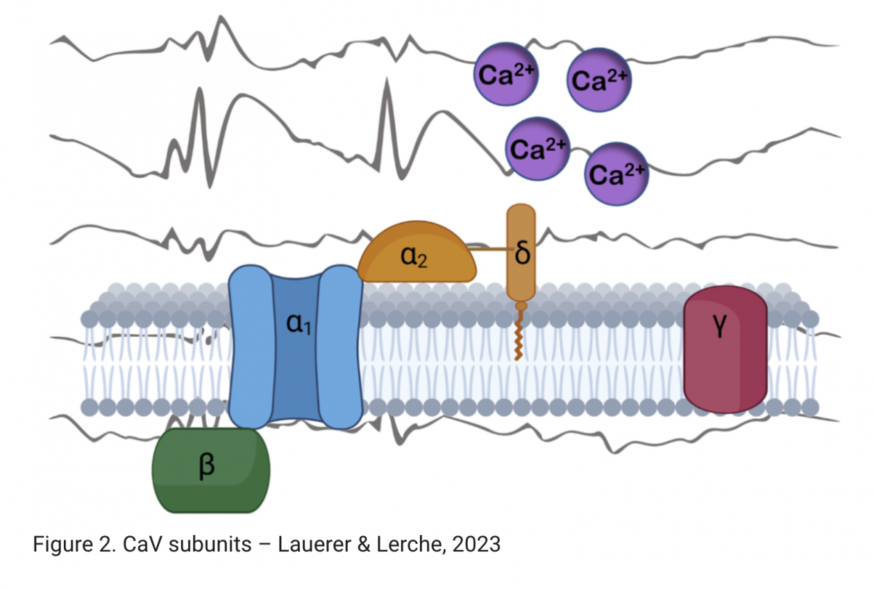 The CaV channels are composed of a main subunit called CaVα1 (alpha one), which forms the pore or channel in the membrane. There are also additional subunits, CaVβ (beta), CaVα2δ (alpha two delta), and CaVγ (gamma) that can sometimes physically interact with the alpha one subunit (Figure 2).